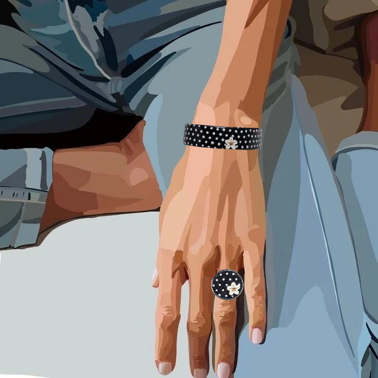 Vintage vibes with a playful twist! This polka dot ring is all about retro charm — featuring a bold black-and-white dotted background topped with a delicate white flower. It’s quirky, cute, and effortlessly chic.