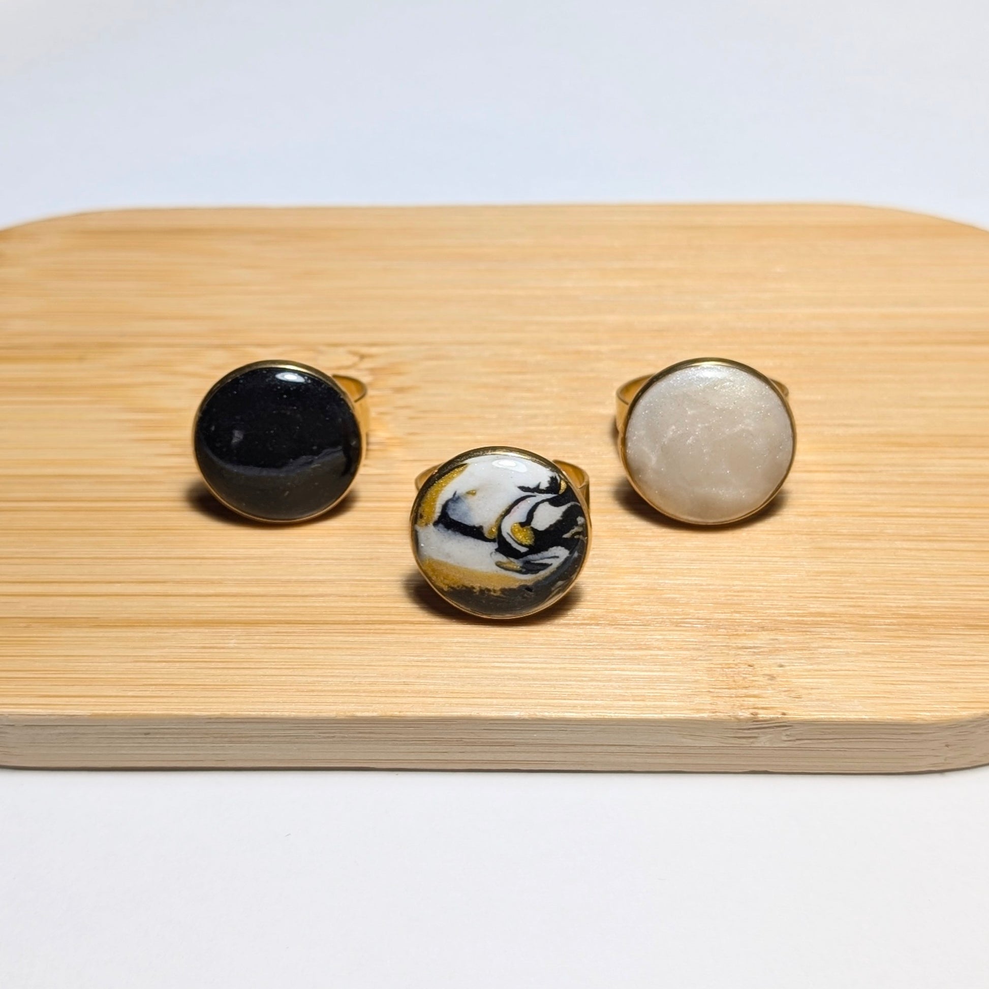 These glossy, circular rings are clean, classic and completely adjustable. Choose a solid color for a brilliant look, or go for the mesmerizing marbled pattern that makes every ring totally unique!