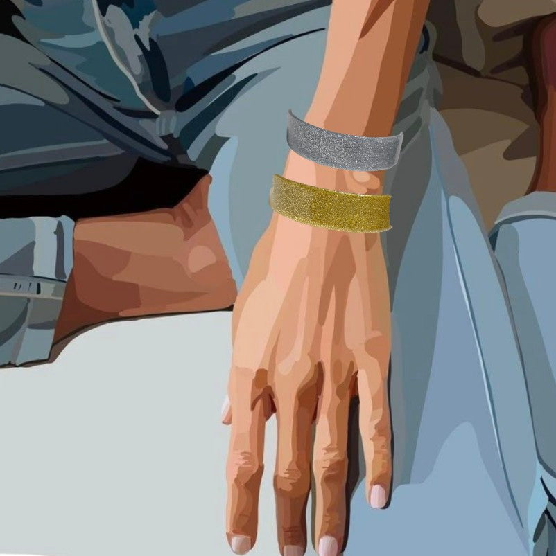 Handmade statement bracelet with a smooth curved form and a delicate shimmer finish. Minimal yet bold, designed to sit comfortably and add a quiet glow to everyday looks.